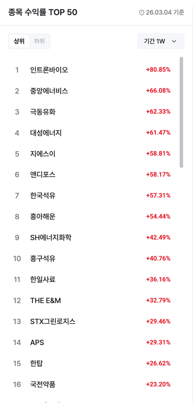 종목 수익률 TOP 50